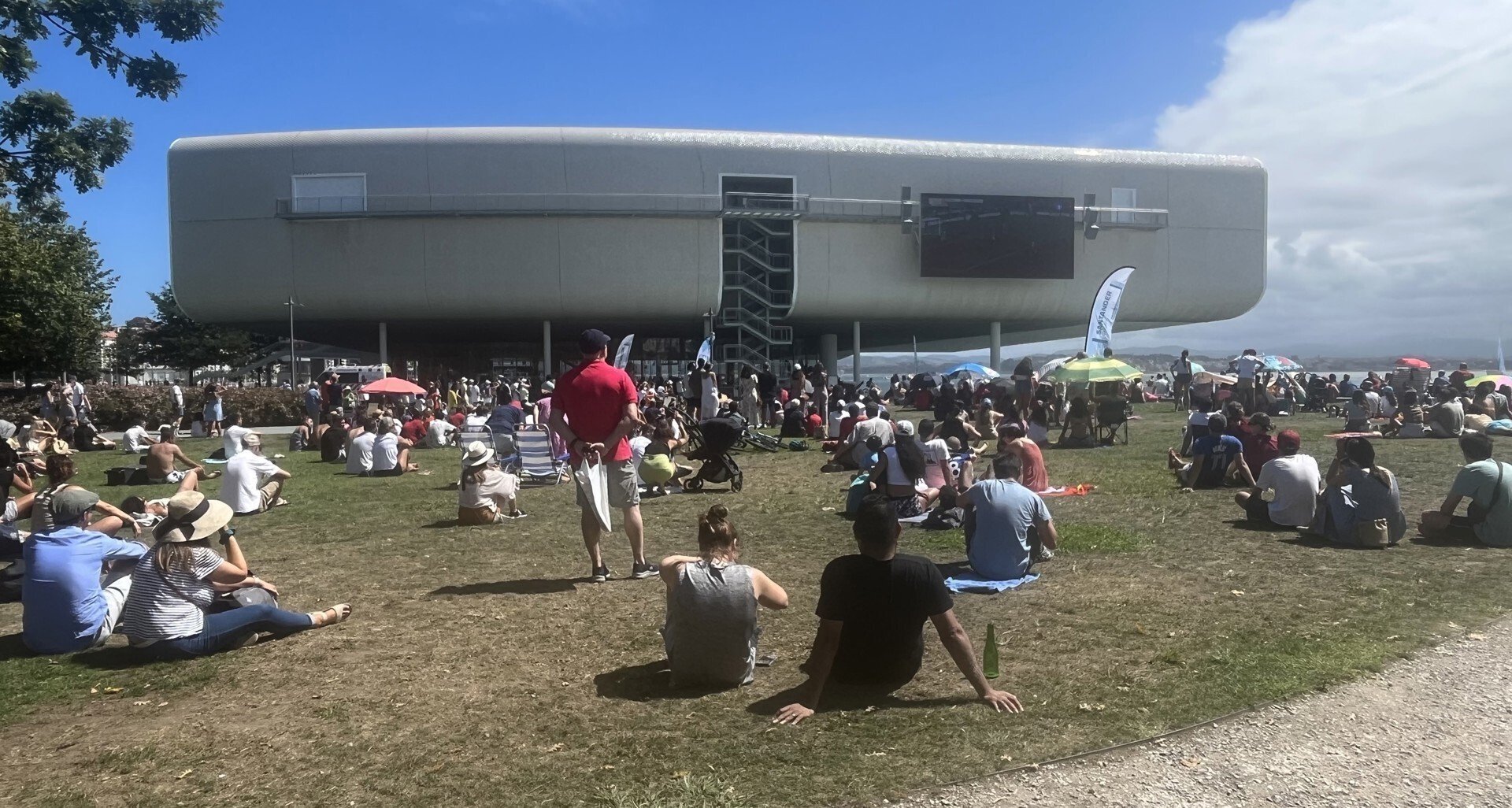 No solo las gradas del anfiteatro y las sillas extra habilitadas se han llenado sino también todo el césped de alrededor desde el que las grandes dimensiones de la plantalla permitían también seguir el partido, que hoy ha hecho cambiar a muchos santanderinos, al menos por unas horas, la playa por los aledaños del Centro Botín.