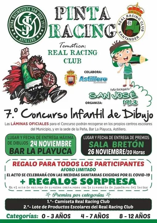El Ayuntamiento de Astillero y la peña racinguista San José 1913 han organizado la séptima edición del concurso infantil de dibujo 'Pinta Racing', en el que los más pequeños optarán a diversos premios y regalos de temática verdiblanca.