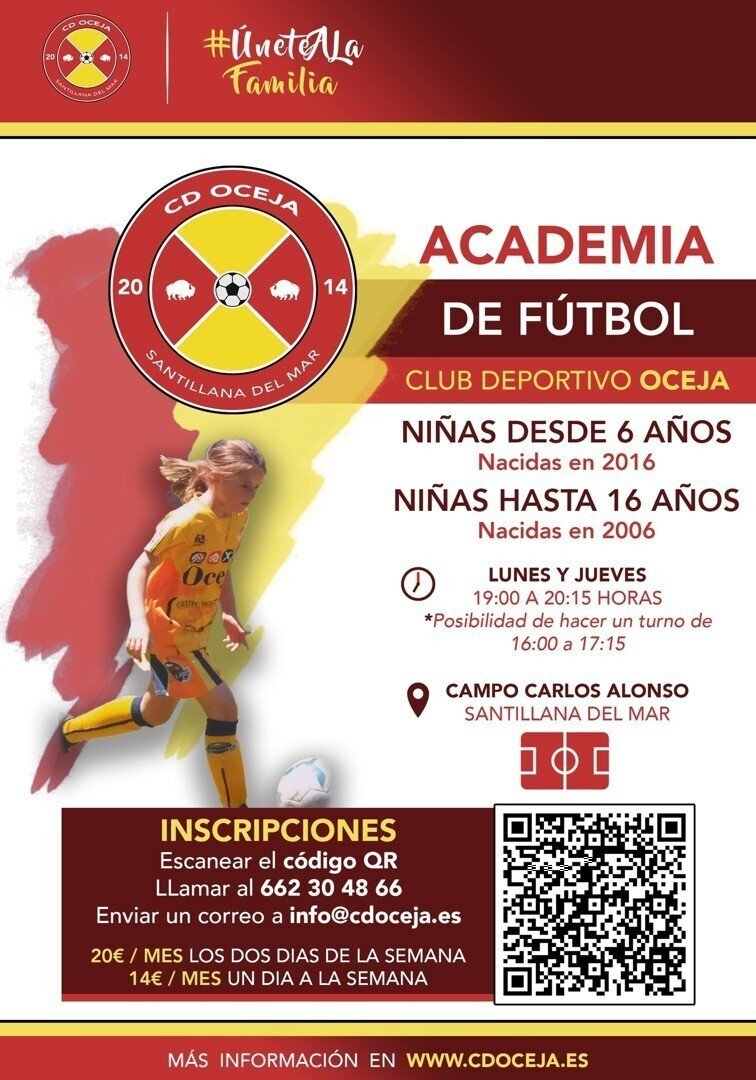 Para tramitar la inscripción en la academia del Club Deportivo Oceja existen varias opciones: escanear el código QR que aparece en el cartel y rellenar el formulario con la información de la niña a participar, llamar al número de teléfono 662 30 48 66 y facilitar los datos por vía telefónica, o bien enviando un correo electrónico a info@cdoceja.es.