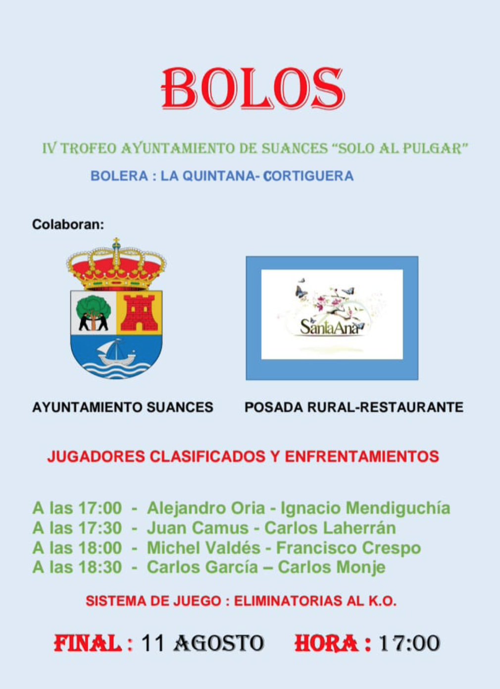 La Bolera La Quintana de Cortiguera (Suances) acoge este miércoles 11 el IV Trofeo Ayuntamiento de Suances 'Sólo al pulgar', una cita que reunirá a ocho jugadores que se enfrentarán al KO en sucesivas eliminatorias.