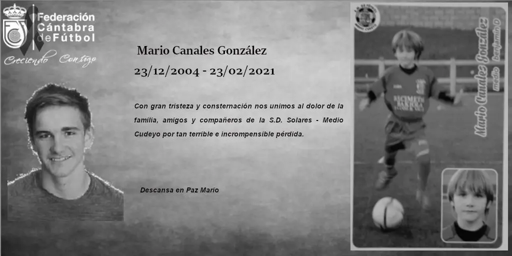 El fútbol cántabro ha expresado su dolor por el fallecimiento, este martes, del joven Mario Canales González, que jugaba en la Sociedad Deportiva Solares-Medio Cudeyo.