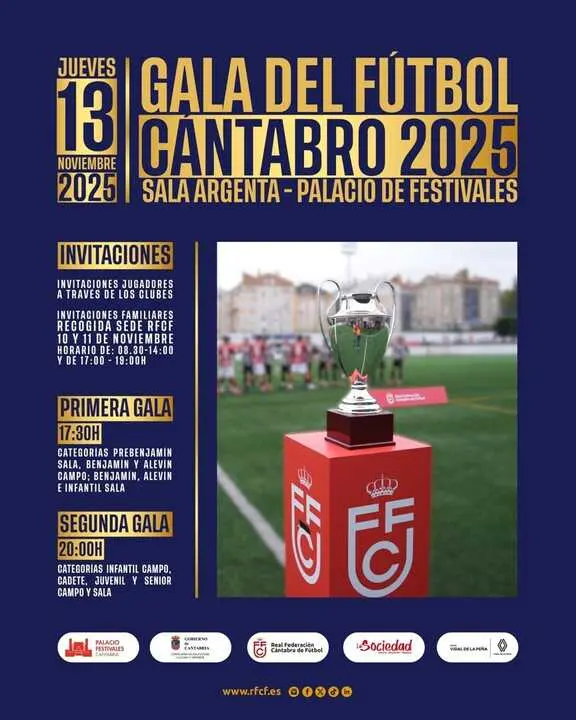 La Sala Argenta del Palacio de Festivales acogerá el jueves 13 de noviembre la Gala del Fútbol Cántabro, que homenajea y distingue a todos los equipos premiados durante la pasada temporada 2024-2025.