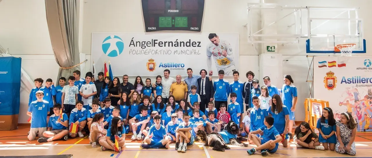 El jugador internacional de balonmano Ángel Fernández, ya da nombre al pabellón deportivo ubicado junto al CEIP José Ramón Sánchez de Astillero, municipio del que es vecino y donde ha descubierto este martes los carteles con su denominación.