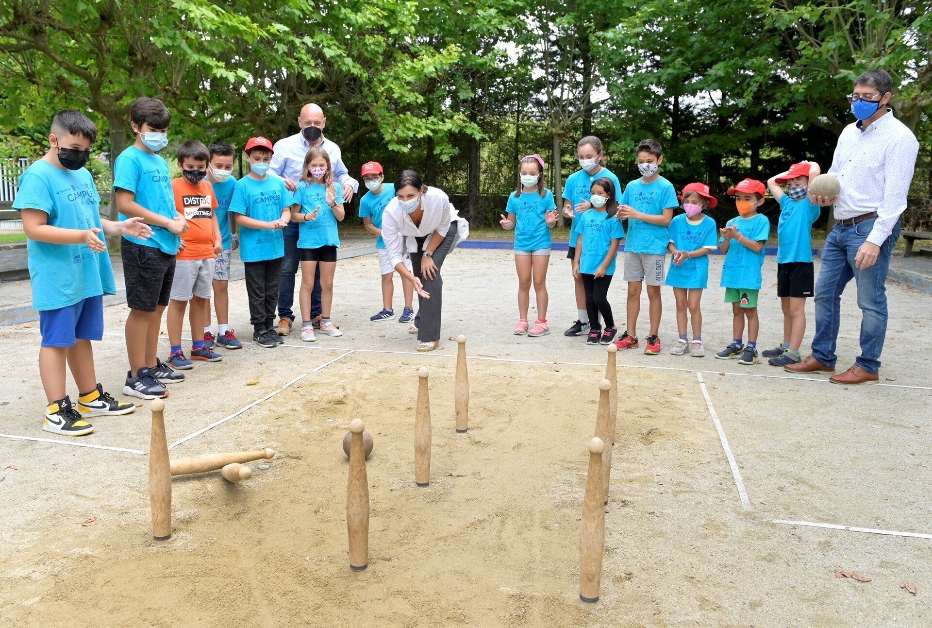 La alcaldesa, Gema Igual, acompañada del concejal de Deporte, Felipe Pérez Manso, y del presidente de la Federación Cántabra de Bolos, Norberto Ortiz, ha visitado a los participantes del campus a quienes ha animado a familiarizarse y practicar este deporte autóctono.