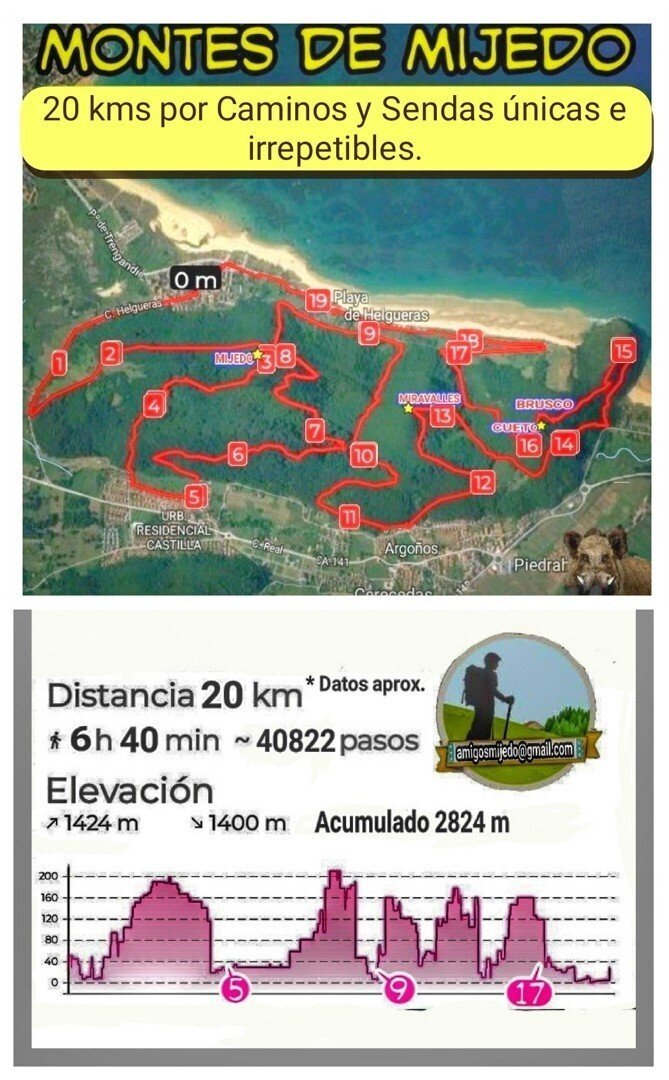 Como ha señalado el colectivo, se utilizarán sendas "antaño usadas", una dificultad a la que hay que añadir las veces que se descenderá y ascenderá el monte a la playa. En total se subirá y bajará cinco veces cima Mijedo (237 metros de altura), el pico Miravalles (218 metros) y el Cueto Brusco (205 metros). El desnivel total acumulado es de 2.824 metros.