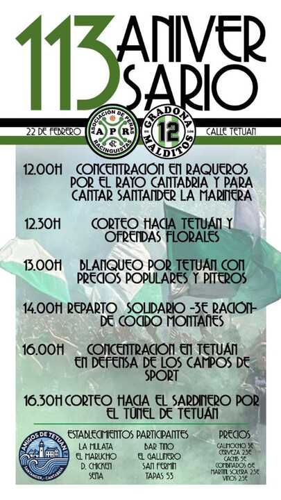 Las peñas racinguistas celebrarán este domingo, 22 de febrero, varios actos para conmemorar el 113 aniversario del club que también incluyen una concentración en Tetuán para denunciar la situación de los Campos de Sport de El Sardinero.