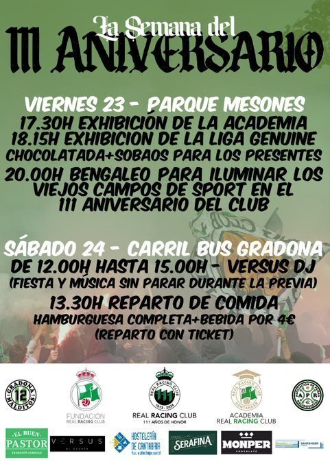 El viernes 23 de febrero, día en que se cumplen 111 años del primer partido conocido del Racing en 1913, se llevarán a cabo demostraciones de la Academia de la Fundación Racing y del equipo de la Liga Genuine en la zona del parque de Mesones.