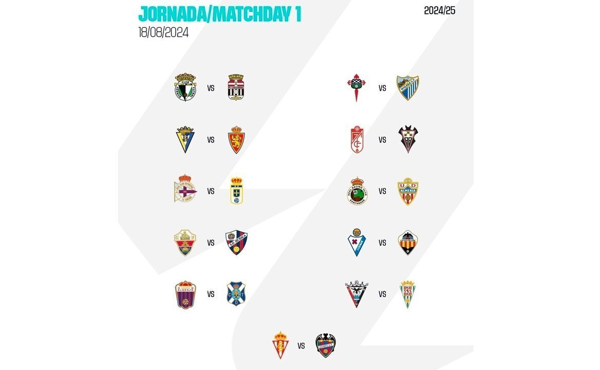 LaLiga Hypermotion 2024-2025 comenzará el fin de semana del 18 de agosto y concluirá el domingo 1 de junio. En la primera jornada, destacan los duelos de los recién descendidos Cádiz-Zaragoza, Granada-Albacete y Racing-Almería, y los clubes ascendidos a la categoría de plata del fútbol nacional Deportivo-Oviedo, Racing Ferrol-Málaga, Eibar-Castellón y Mirandés-Córdoba.
