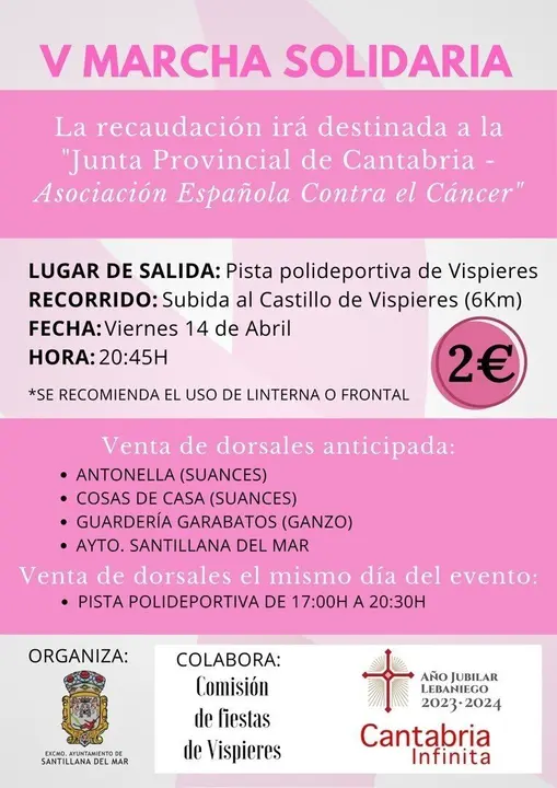 Santillana del Mar celebra este viernes, 14 de abril, la 'V Marcha Solidaria contra el Cáncer' en la localidad de Vispieres, una iniciativa en la que todo lo recaudado irá dirigido a la Asociación Española contra el Cáncer.