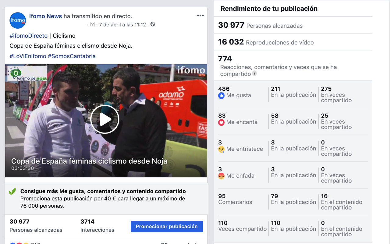 Mas de 30.000 personas siguieron la retransmisión realizada y producida de forma íntegra por ifomo News del IV Trofeo Villa de Noja - Gran Premio Cantabria Deportes, Copa España Féminas Cofidis 2019.