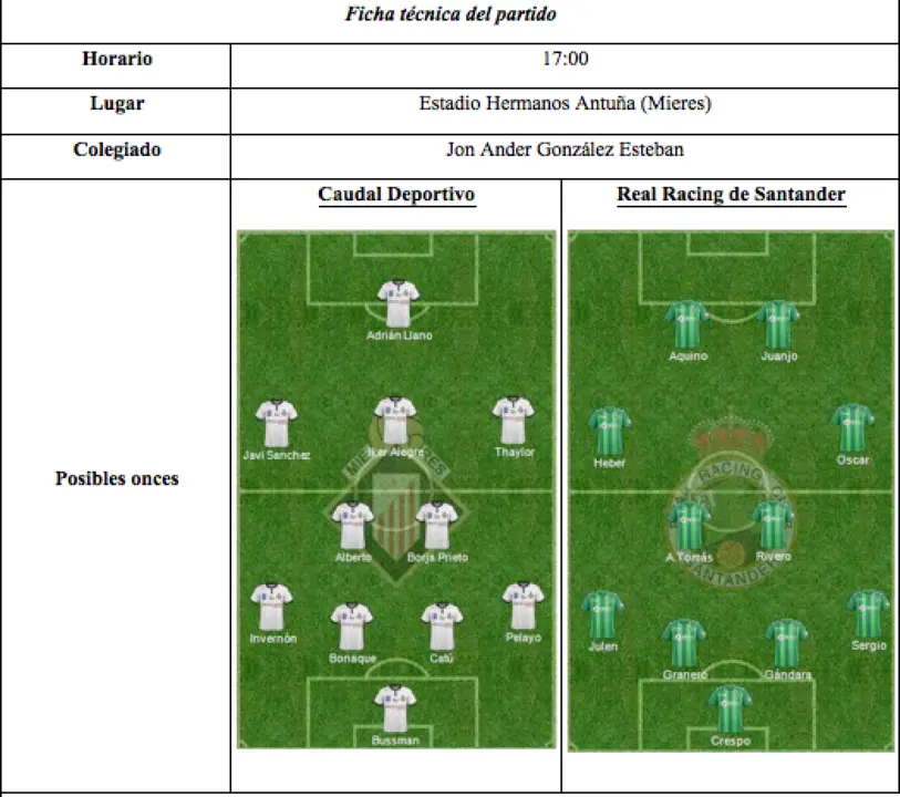 Los asturianos tienen jugadores capaces de complicar el partido al Racing, como por ejemplo Iker Alegre, un extremo izquierdo muy peligroso que ha conseguido marcar dos goles en este inicio de temporada; y Thaylor, extremo derecho Hispano-Angoleño de 23 años y que en Agosto estuvo convocado en dos ocasiones con el Eibar, la última tan sólo cuatro días antes de llegar libre al Caudal.