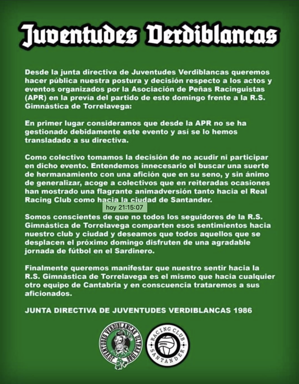 Pues bien, poco después, dos peñas del Racing publicaban comunicados en sus redes sociales anunciando su no participación en el evento, la tradicional Juventudes Verdiblancas y la Peña San José 1913.