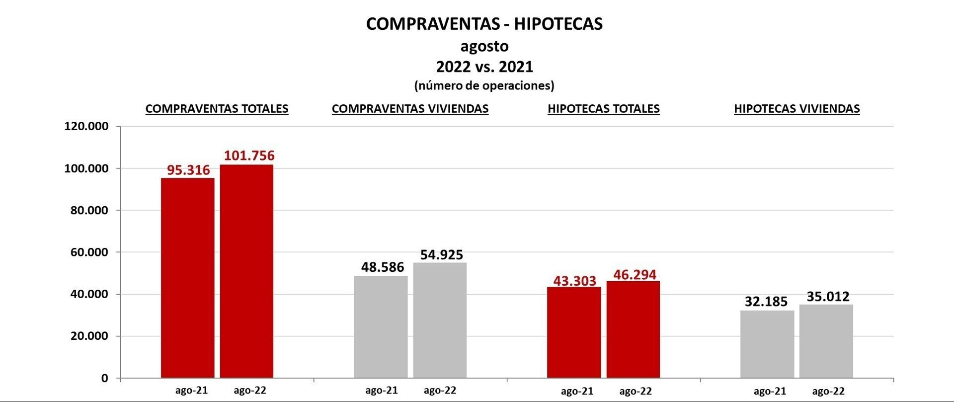 En cuanto a las compraventas totales, en agosto se inscribieron 101.756 operaciones, un 6,8% más que en agosto de 2021. El Colegio de Registradores destaca este crecimiento "después de la ralentización del mes de julio", cuando la cifra solo aumentó un 0,1% respecto a julio de 2021.