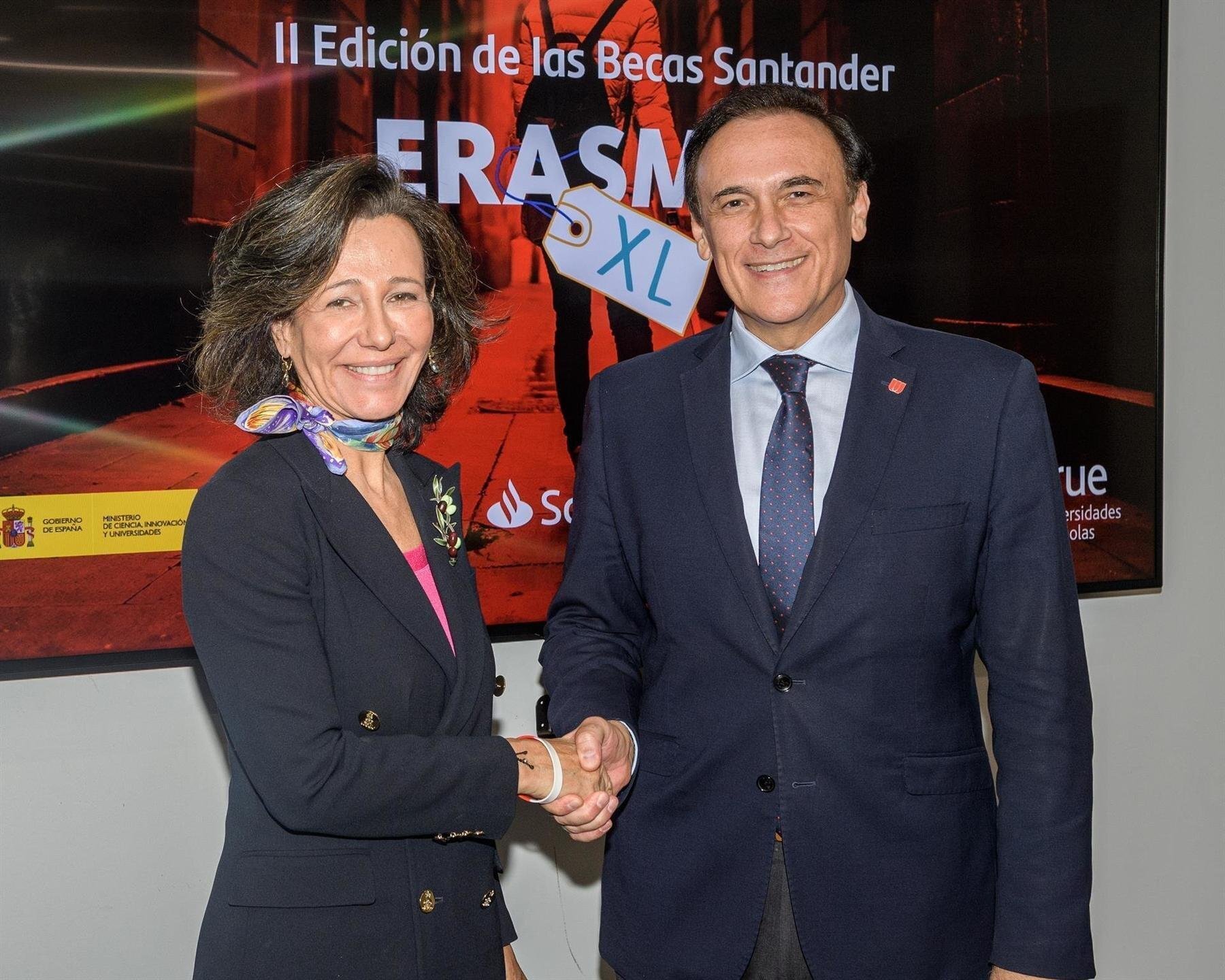 El presidente de la Conferencia de Rectores de Universidades Españolas (CRUE), José Carlos Gómez Villamandos, y la presidenta de Banco Santander y Universia, Ana Botín, han firmado este lunes un acuerdo para impulsar más de 5.000 nuevas Becas Santander Erasmus con el apoyo del Ministerio de Ciencia, Innovación y Universidades.