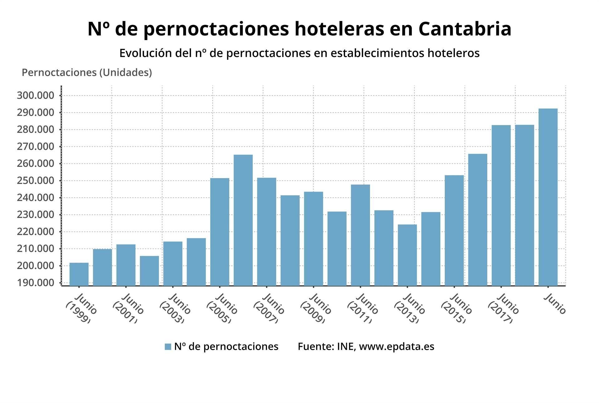 Así lo publica hoy el Instituto Cántabro de Estadística (ICANE), con datos remitidos por el Instituto Nacional de Estadística (INE). Según los mismos, las pernoctaciones hoteleras repuntaron en junio en Cantabria, hasta alcanzar las 292.349.