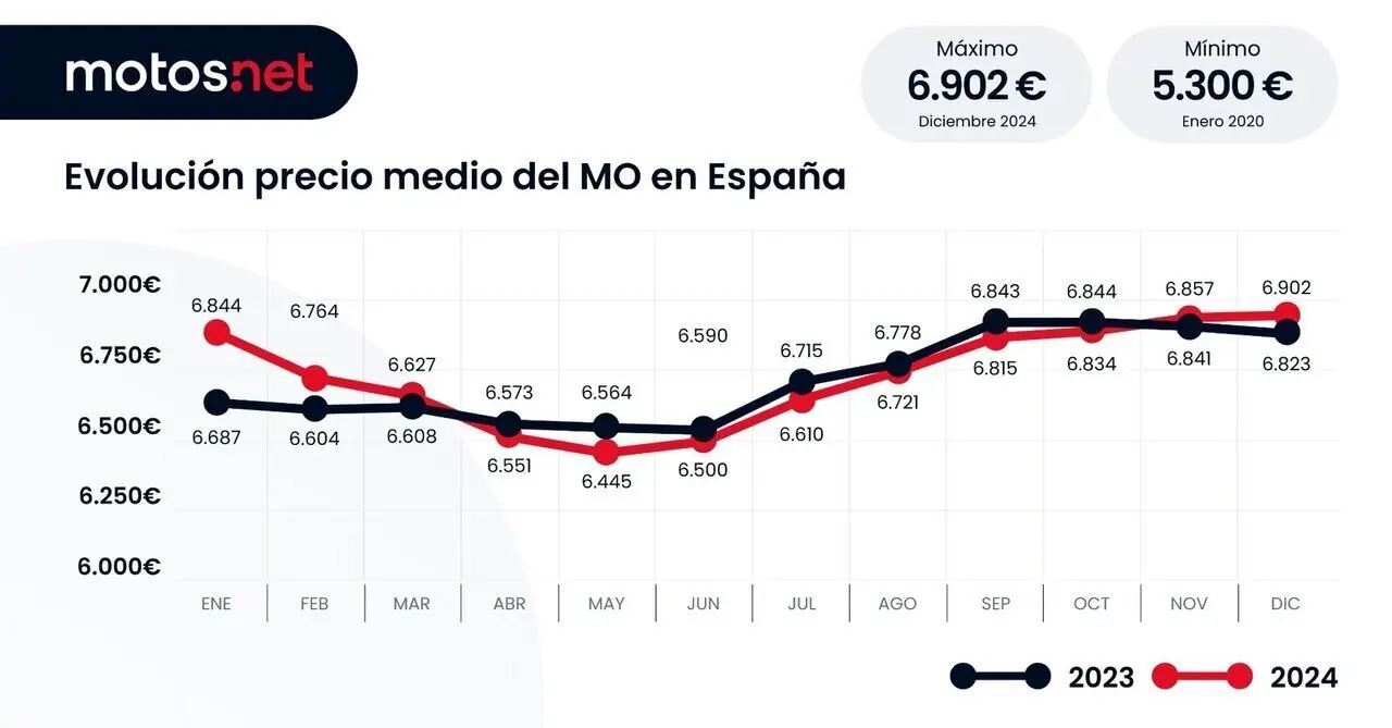 En España, el precio de oferta de la moto de ocasión cerró 2024 con un crecimiento del 1,2% respecto al año anterior y batió récord, hasta situarse en los 6.902 euros de media.