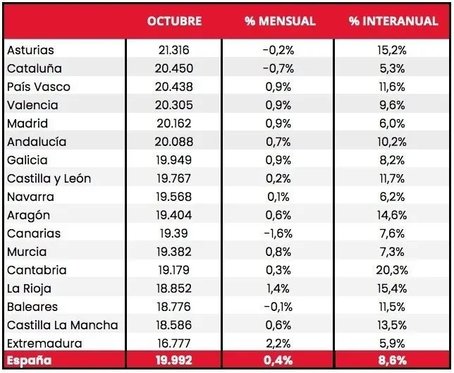 Tras Asturias, las siguientes comunidades autónomas con los precios más altos son Cataluña, con 20.450 euros (+5,3% interanual), País Vasco (20.438 euros; +11,6%), Valencia (20.305 euros; +9,6%) y Madrid (20.162 euros; +6%).