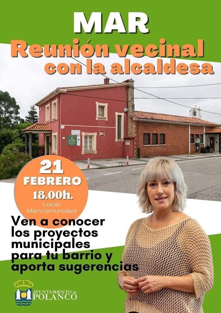 La alcaldesa de Polanco, Rosa Díaz, iniciará este martes, 21 de febrero en Mar un ciclo de encuentros vecinales con el objetivo de presentar barrio por barrio los proyectos municipales que están en marcha y, a la vez, recabar sugerencias de los vecinos sobre otras actuaciones que es necesario acometer.