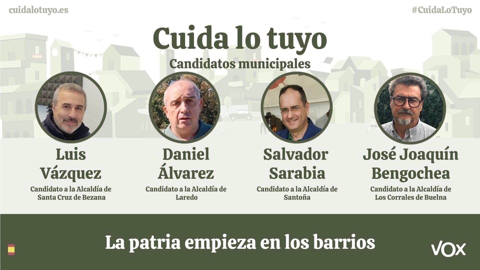 El Comité Ejecutivo Nacional (CEN) de Vox ha designado a Luis Vázquez, Daniel Álvarez, Salvador Sarabia y José Joaquín Bengochea como candidatos a las alcaldías de Santa Cruz de Bezana, Laredo, Santoña y Los Corrales de Buelna, respectivamente.