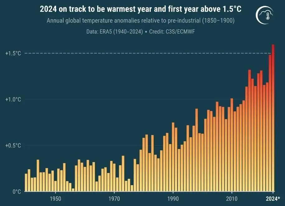 Octubre de 2024 fue 1,65 °C superior al nivel preindustrial y fue el decimoquinto mes de un período de 16 meses en el que la temperatura media global del aire en la superficie superó en 1,5 °C los niveles preindustriales.