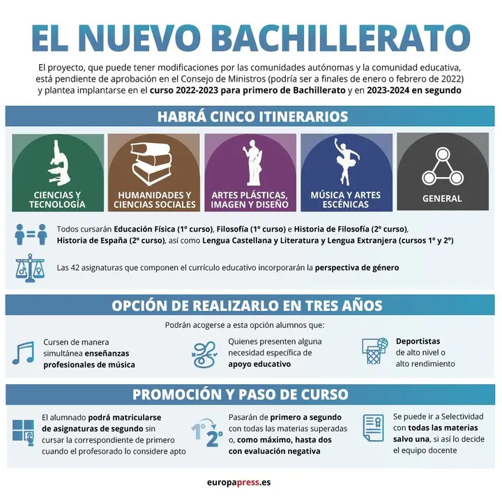 El Consejo de Ministros ha aprobado este martes, a propuesta del Ministerio de Educación y FP, el Real Decreto por el que se establece la ordenación y las enseñanzas mínimas de Bachillerato. Estos cambios se implantarán en el año académico 2022-2023 para 1º de Bachillerato y en el curso 2023-2024 para el 2º curso.