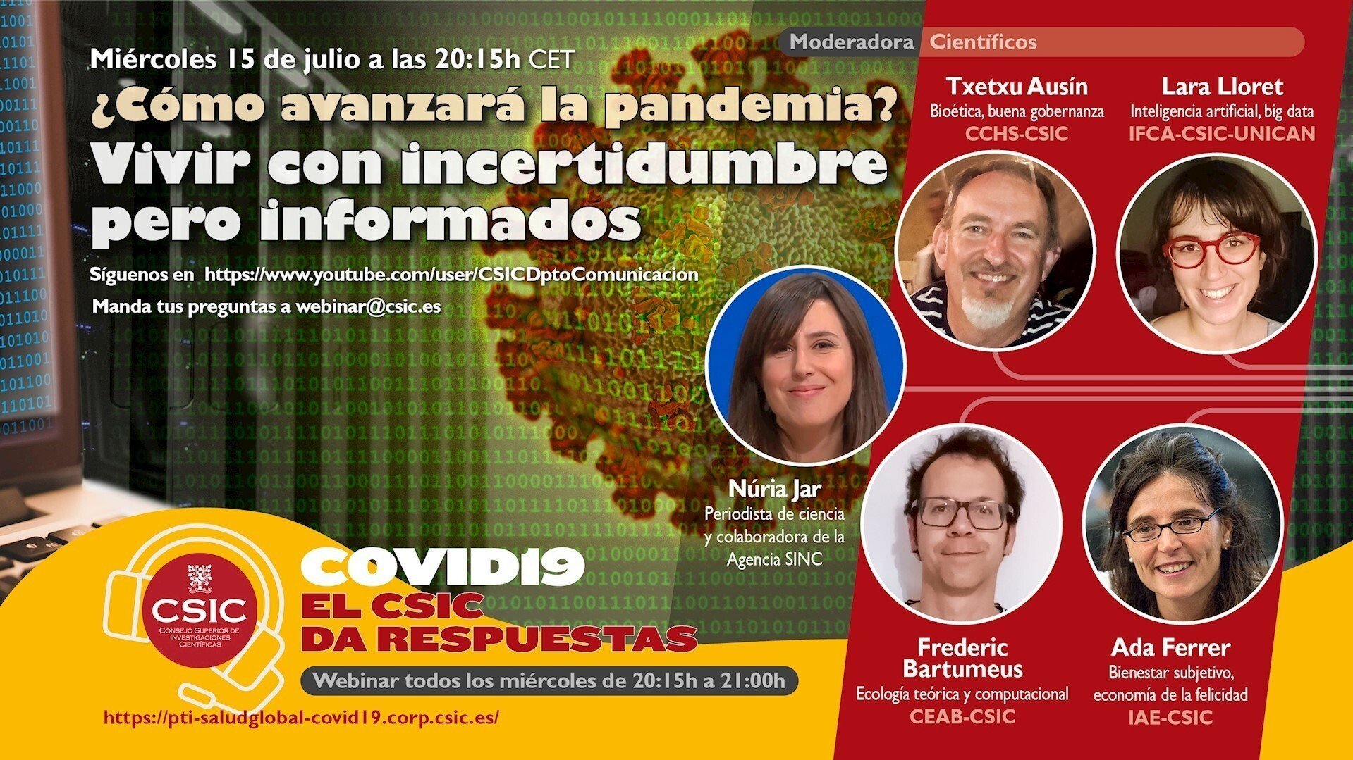 Científicos del Consejo Superior de Investigaciones Científicas (CSIC) responderán a preguntas de los ciudadanos sobre la posibilidad de predecir la evolución de la pandemia con la información disponible hoy en un webinar que se emitirá este miércoles, 15 de julio, a las 20.15 horas, en el canal de YouTube del CSIC.