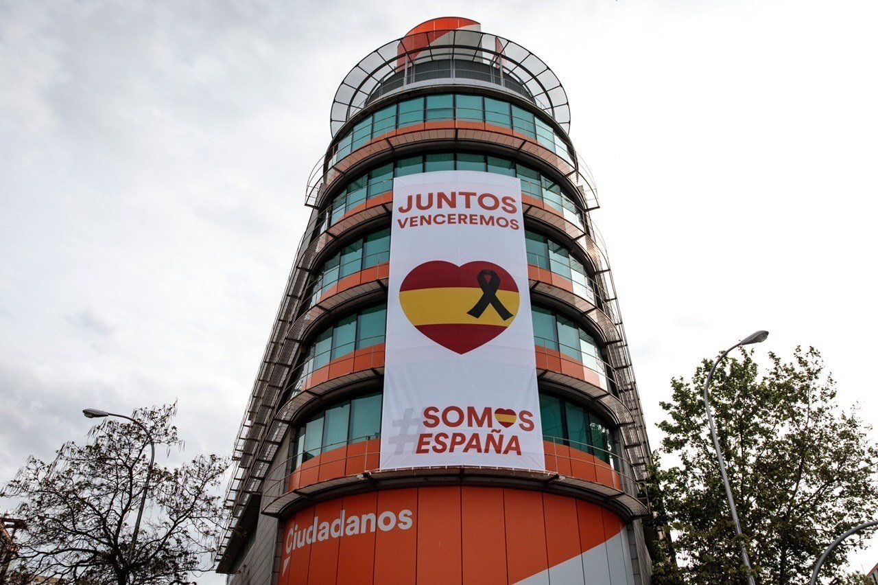 Ciudadanos ha desplegado una lona en su sede nacional de Madrid en la que se visualiza un corazón gigante con la enseña nacional y un crespón negro en memoria a los fallecidos por coronavirus y dos mensajes en los que se puede leer "Juntos venceremos" y "Somos España".