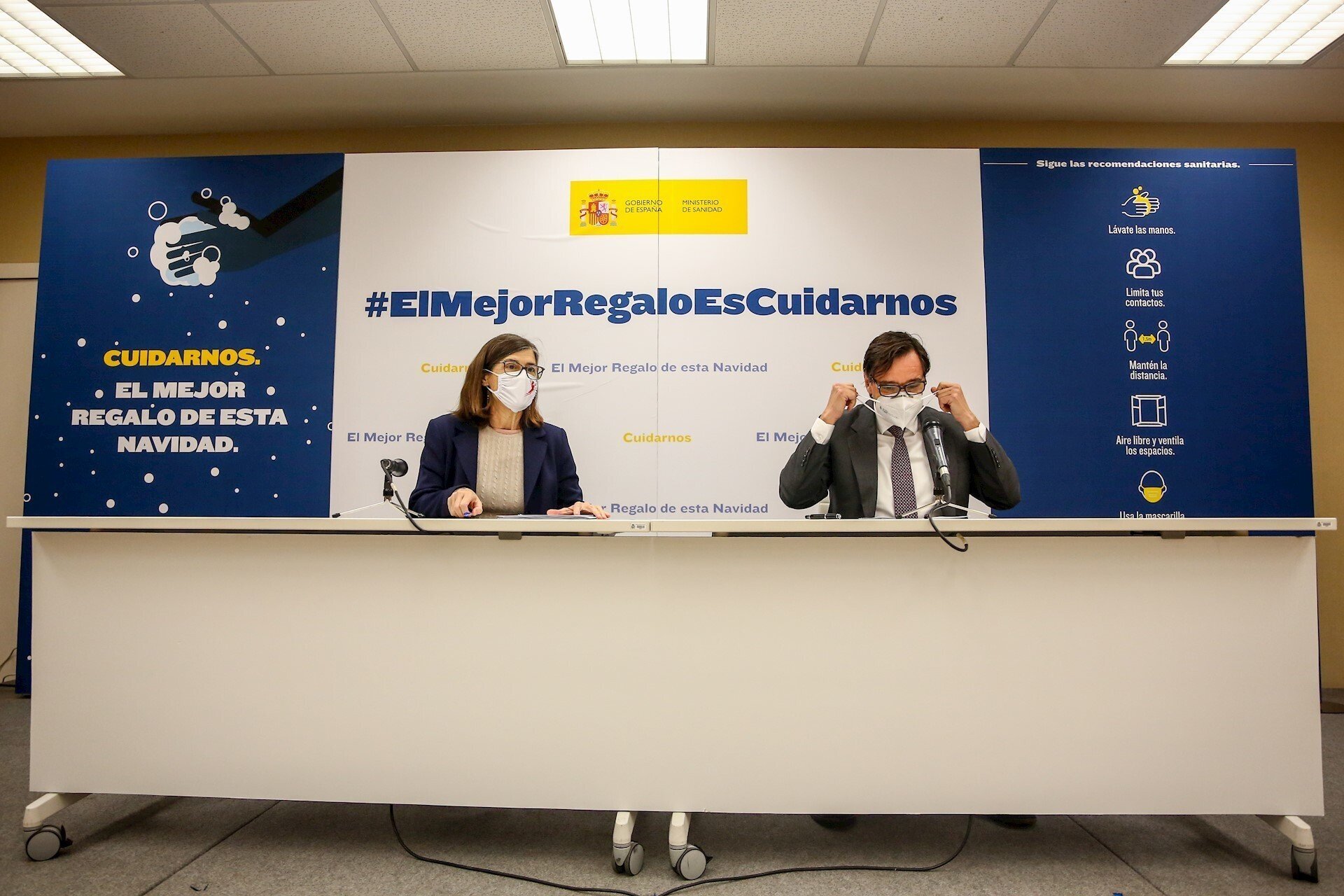 El Ministerio de Sanidad ha presentado la campaña de Navidad bajo el lema 'Cuidarnos. El mejor regalo de esta Navidad', que incluye un spot con versiones de distinta duración en el que se hace hincapié en mantener las medidas de prevención --ventilación de espacios, lavado de manos o mascarillas en reuniones familiares--.
