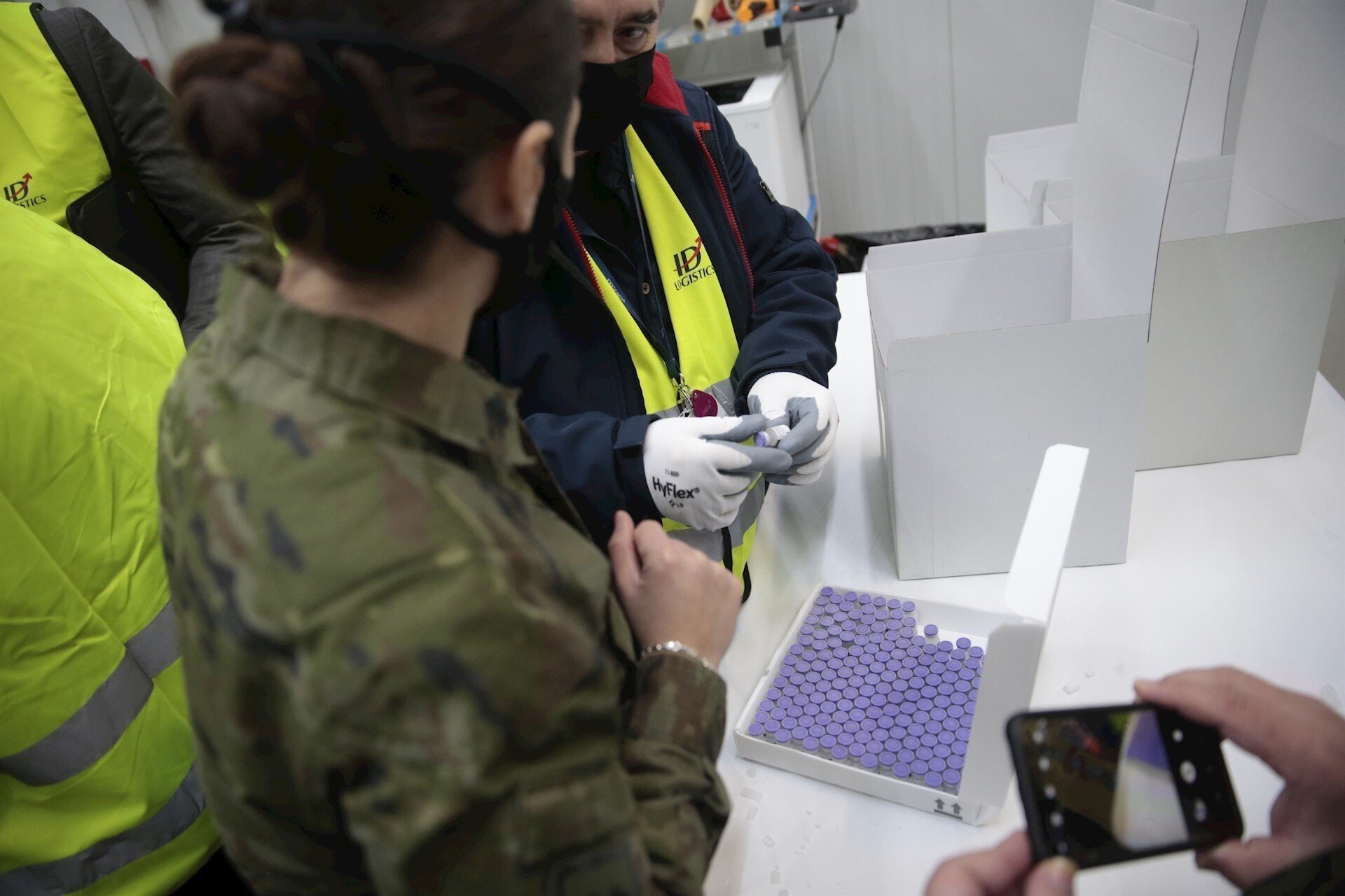 Tras la llegada de las primeras dosis a Guadalajara, el personal del Ejército ha recogido las bandejas correspondientes a Canarias, Baleares, Ceuta y Melilla para su transporte aéreo. Las restantes serán distribuidas por carretera.