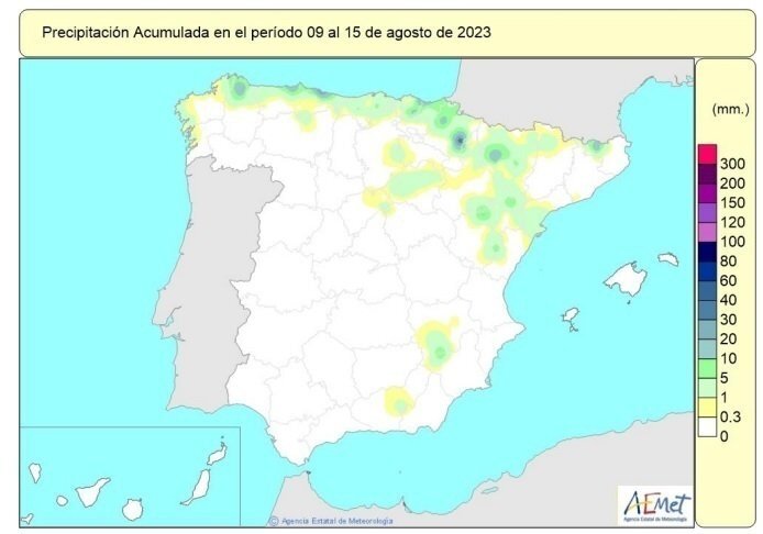 En la semana comprendida entre el 9 y el 15 de agosto, las precipitaciones afectaron al tercio norte peninsular, a su cuadrante noreste y a zonas más puntuales del este de Andalucía en la cordillera Bética.