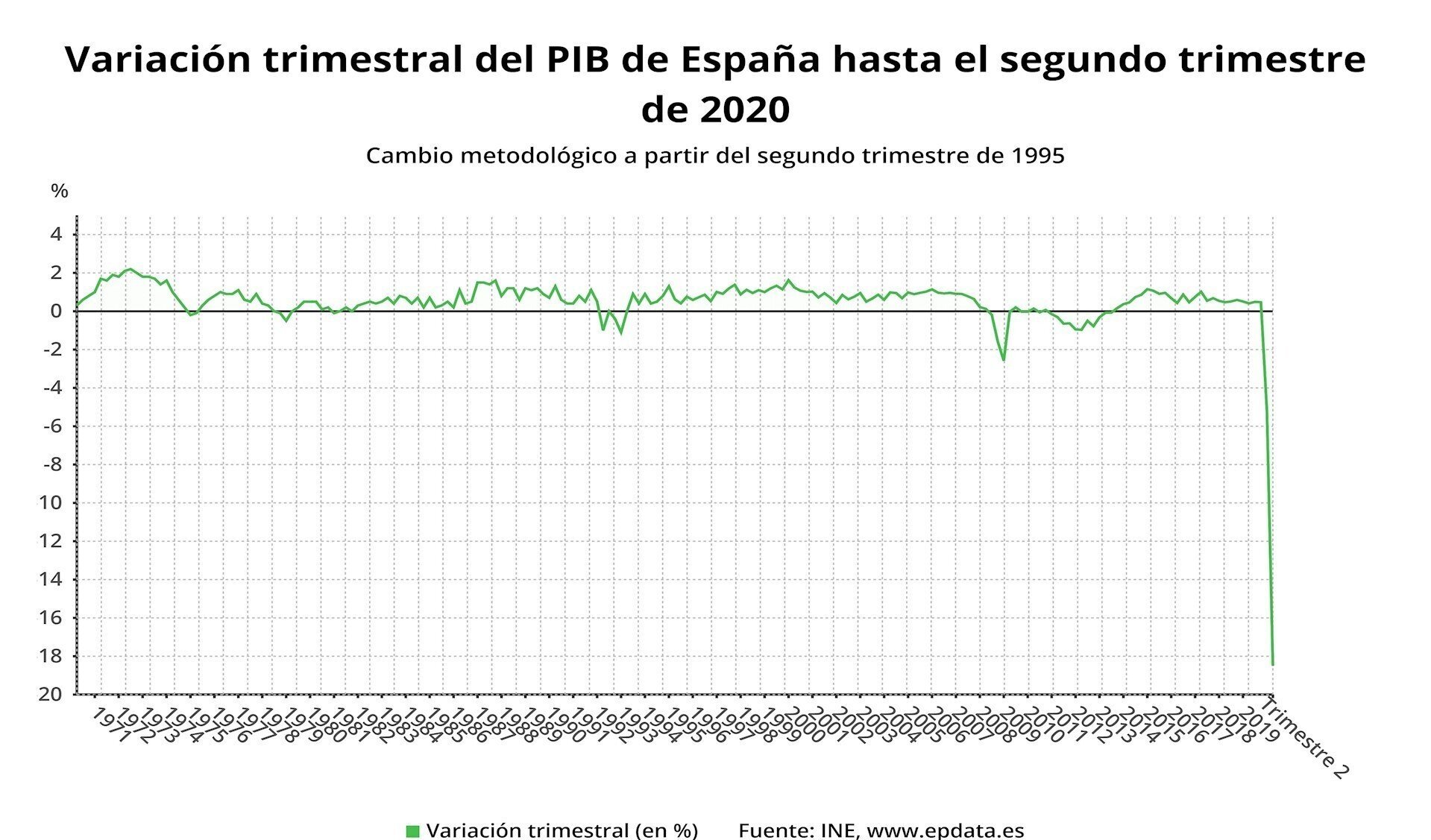 La economía española entró en recesión técnica en el segundo trimestre del año tras registrar un desplome del PIB del 18,5% entre abril y junio, su mayor caída trimestral en la serie histórica que maneja el Instituto Nacional de Estadística (INE) y que arranca en 1970. Hasta ahora, los mayores retrocesos trimestrales del PIB habían sido el del primer trimestre de este año (-5,2%) y el del primer trimestre de 2009 (-2,6%).