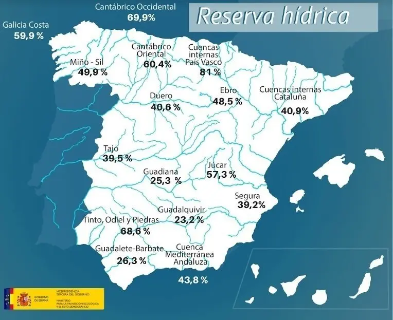 Mientras, ocho cuencas hidrográficas guardan menos agua que lo que permite la mitad de su capacidad. Son los embalses de las cuencas del Duero, que está al 40,6 por ciento; Tajo, al 39,5 por ciento; Guadiana, al 25,3 por ciento; Guadalete-Barbate, al 26,3 por ciento; Guadalquivir, al 23,2 por ciento; la cuenca Mediterránea Andaluza, al 43,8 por ciento; Segura, al 39,2 por ciento y las cuencas internas de Cataluña, al 40,9 por ciento.