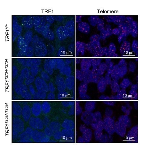 Los investigadores del CNIO Raúl Sánchez y Paula Martínez, dirigidos por Maria A. Blasco, se propusieron determinar qué importancia tenían los telómeros en esta ruta de señalización. Para ello, los investigadores modificaron la proteína TRF1 en células para que fuese insensible a AKT, usando la herramienta de edición genética CRISPR/Cas9.