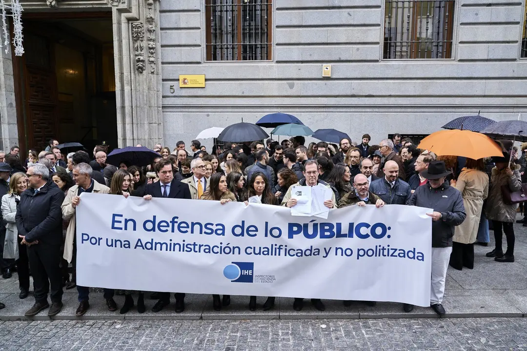 Unos 200 inspectores de Hacienda del Estado se han manifestado por primera vez en su historia este miércoles ante la puerta del Ministerio de Hacienda y Función Pública para protestar contra el acuerdo alcanzado entre algunas organizaciones sindicales y Función Pública para flexibilizar las pruebas de acceso de promoción interna.