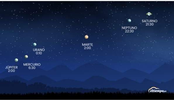Seis planetas se podrán ver simultáneamente antes del amanecer de este miércoles en la mayor parte de España en un fenómeno que no se repetirá en una década, según ha indicado Eltiempo. En concreto, Mercurio, Marte, Júpiter, Saturno, Urano y Neptuno se podrán apreciar a simple vista desde las 21:30 (hora peninsular). De todos ellos, Saturno será visible durante casi toda la noche del martes a partir de las 21:30 horas, más o menos.