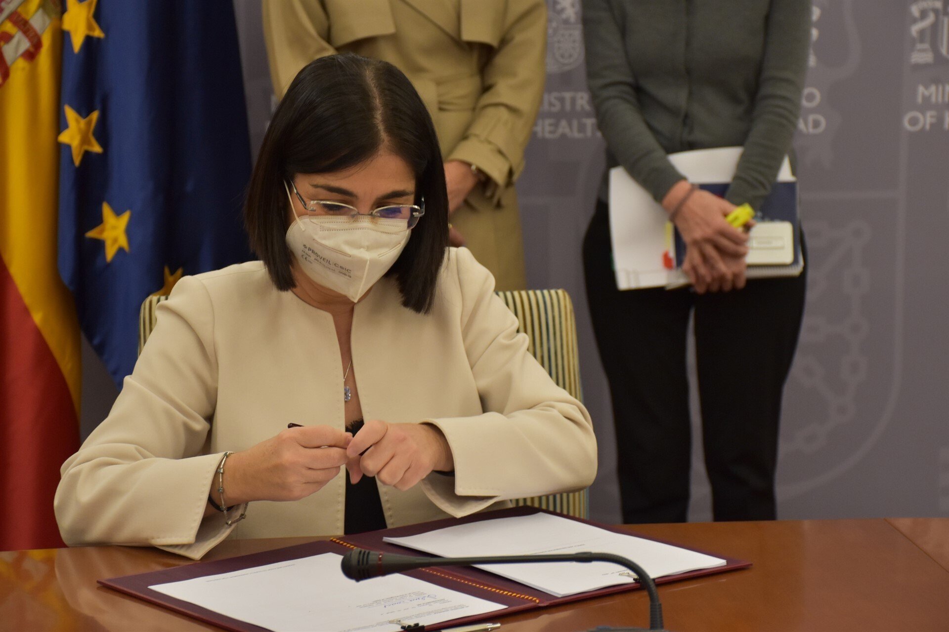 La ministra de Sanidad, Carolina Darias, ha anunciado que este mes de febrero los pacientes con un sistemas inmunitarios comprometidos tendrá acceso 'Evusheld', el antiviral de AstraZeneca contra la COVID-19, gracias al acuerdo firmado este viernes con la compañía farmacéutica.