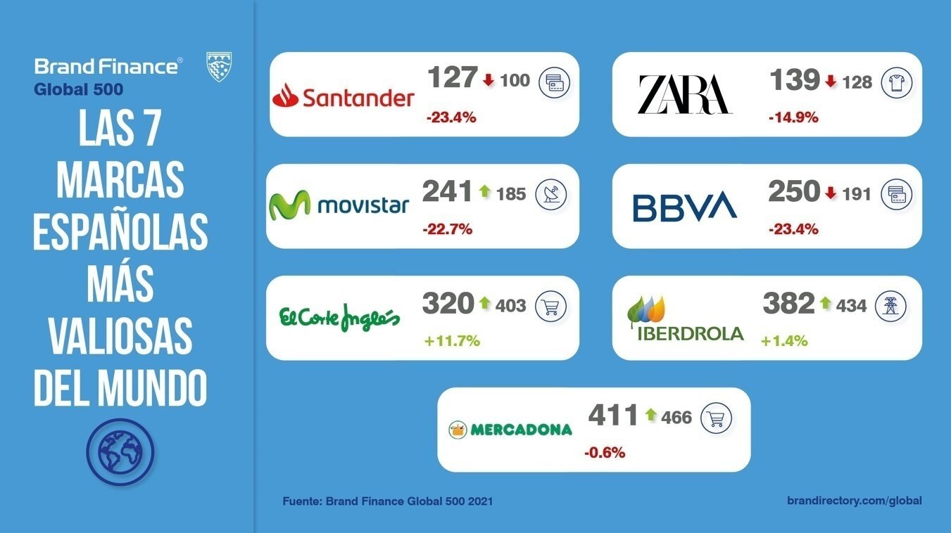Santander, Zara, Movistar, BBVA, El Corte Inglés, Iberdrola y Mercadona siguen siendo las marcas españolas más valiosas del mundo tras un año marcado por la crisis sanitaria del coronavirus, según el último informe anual Global 500 2021 de Brand Finance.