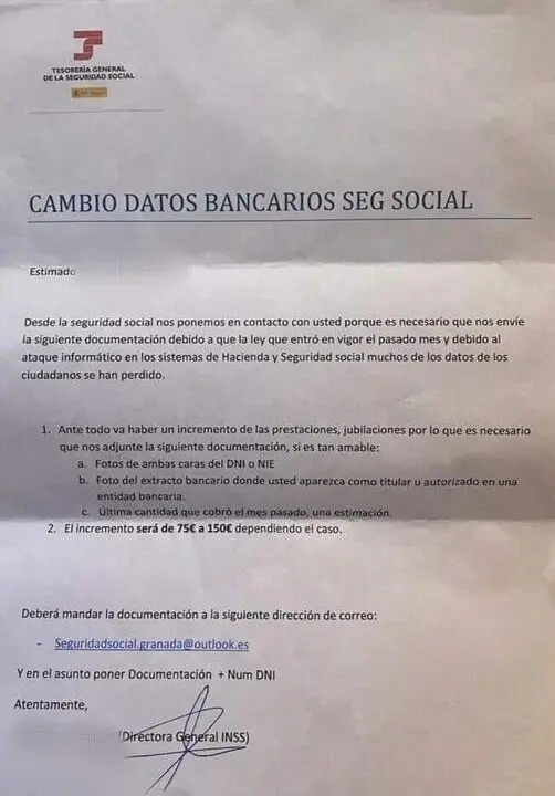 Los estafadores informan además en la misiva de que habrá un incremento de las prestaciones, de 75 a 150 euros, dependiendo de cada caso.