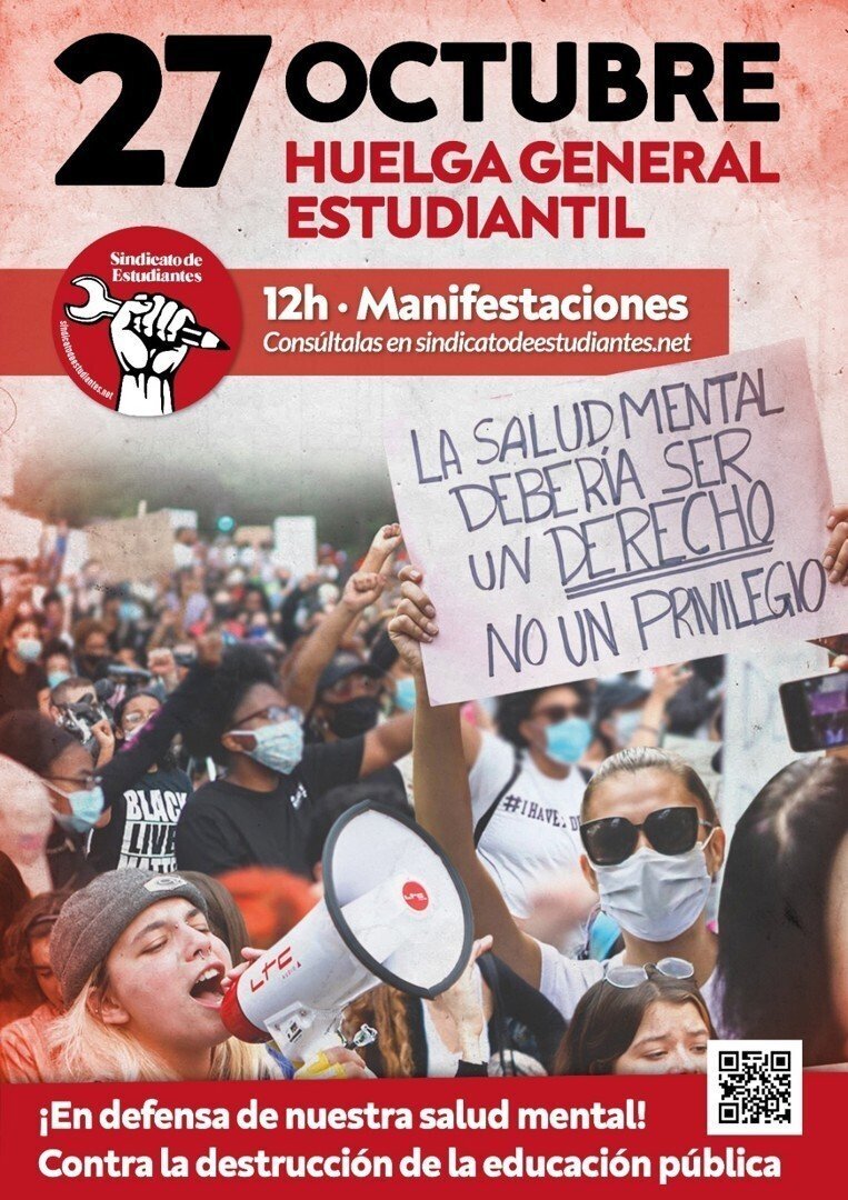 El Sindicato de Estudiantes ha convocado una huelga general estudiantil el próximo 27 de octubre en defensa de la salud mental de los alumnos y "contra la destrucción de la educación pública", así como manifestaciones programadas para las 12.00 horas.