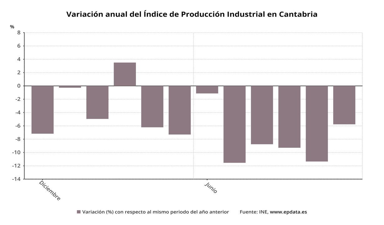 A lo largo del año la producción industrial en Cantabria ha caído un -5,9%, frente a una descenso del -0,8% de la media del país, lo que supone la segunda mayor bajada solo por detrás de la de la Región de Murcia (-0,8%).