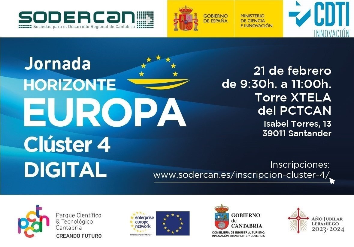La Sociedad para el Desarrollo de Cantabria, SODERCAN (www.sodercan.es), perteneciente a la Consejería de Industria e Innovación, ha programado con el Centro para el Desarrollo Tecnológico Industrial (CDTI) una jornada informativa de carácter sectorial sobre Horizonte Europa, el nuevo Programa Marco de Investigación e Innovación de la Unión Europea para el periodo 2021-2027, dirigida a todo tipo de entidades que tengan potencial de I+D en el ámbito Digital (Clúster 4).
