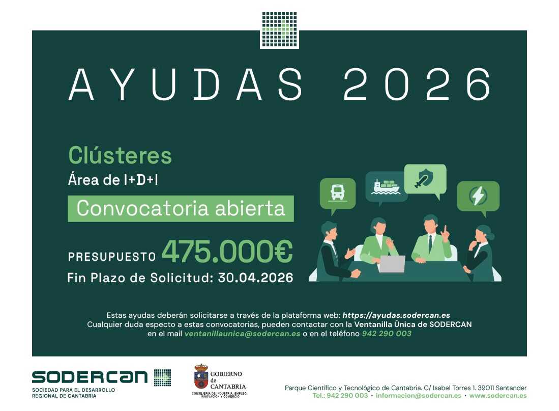 La Sociedad para el Desarrollo de Cantabria, SODERCAN, adscrita a la Consejería de Industria, Empleo, Innovación y Comercio del Gobierno de Cantabria, ha lanzado la convocatoria anual de ayudas para los clústeres sectoriales de la Comunidad Autónoma, con un presupuesto de 475.000 euros.
