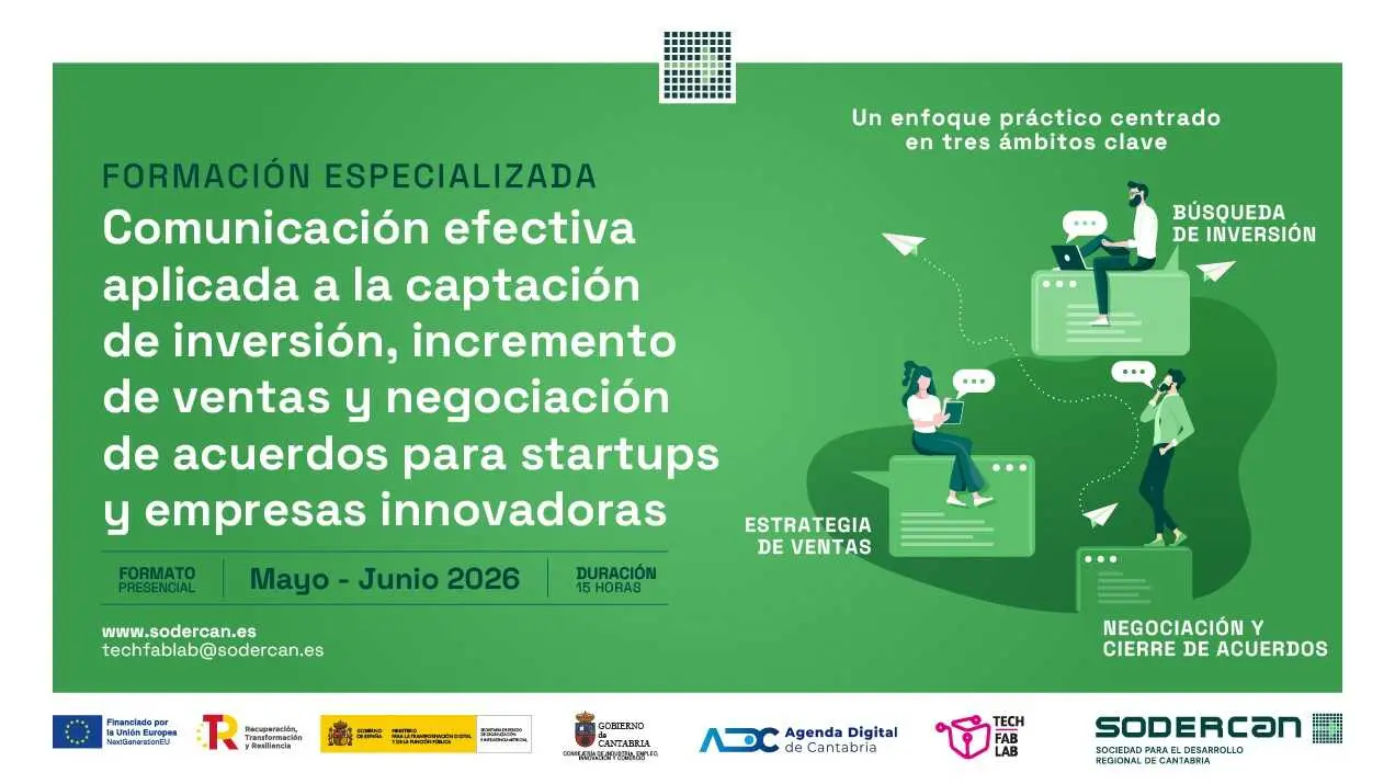 La Sociedad para el Desarrollo de Cantabria, SODERCAN (www.sodercan.es), dependiente de la Consejería de Industria, refuerza su apuesta por el emprendimiento innovador con el lanzamiento de un programa especializado de formación orientado a mejorar las competencias comunicativas estratégicas de startups y empresas de base tecnológica.
