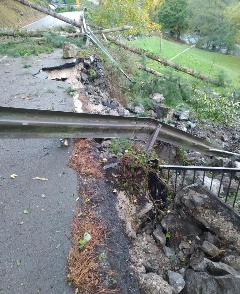 Esta carretera autonómica ha quedado hundida y fracturada en algunos puntos, además de cortada por los árboles y ramas desprendidos en ella, aunque ya se ha podido habilitar un carril para permitir la circulación a los vecinos.