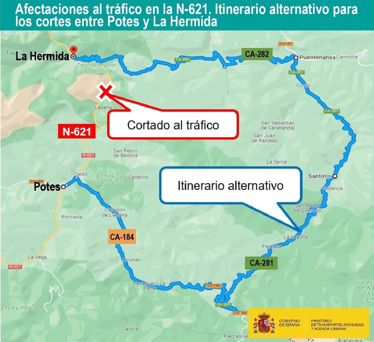 Como itinerario alternativo se proponen el de las carreteras CA-184 (entre Potes y Piedrasluengas), CA-281 (entre Piedraluengas y Puentenansa), CA-282 (entre Puentenansa y La Hermida) y CA-181 (entre Pesués y Puentenansa), ha informado el Mitma.