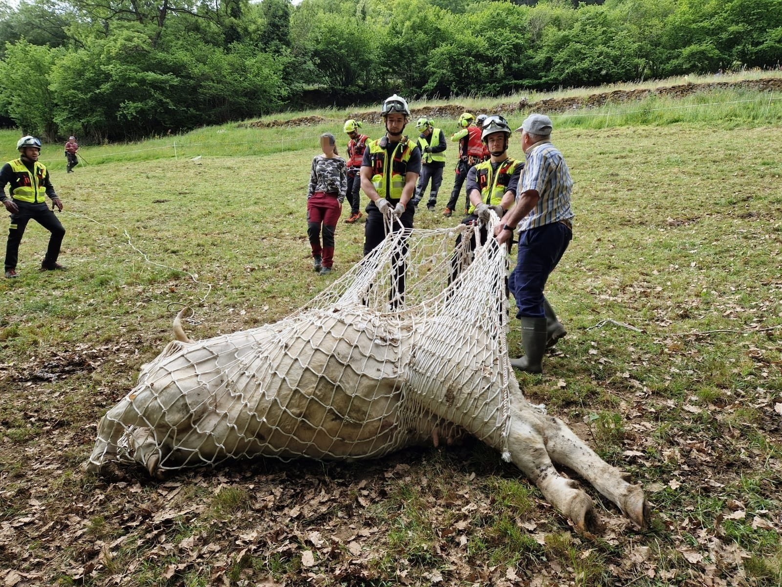 El helicóptero del Gobierno de Cantabria ha evacuado a una vaca que se encontraba tirada en el suelo e inmóvil con una pata rota en la localidad de Vada, en Vega de Liébana.