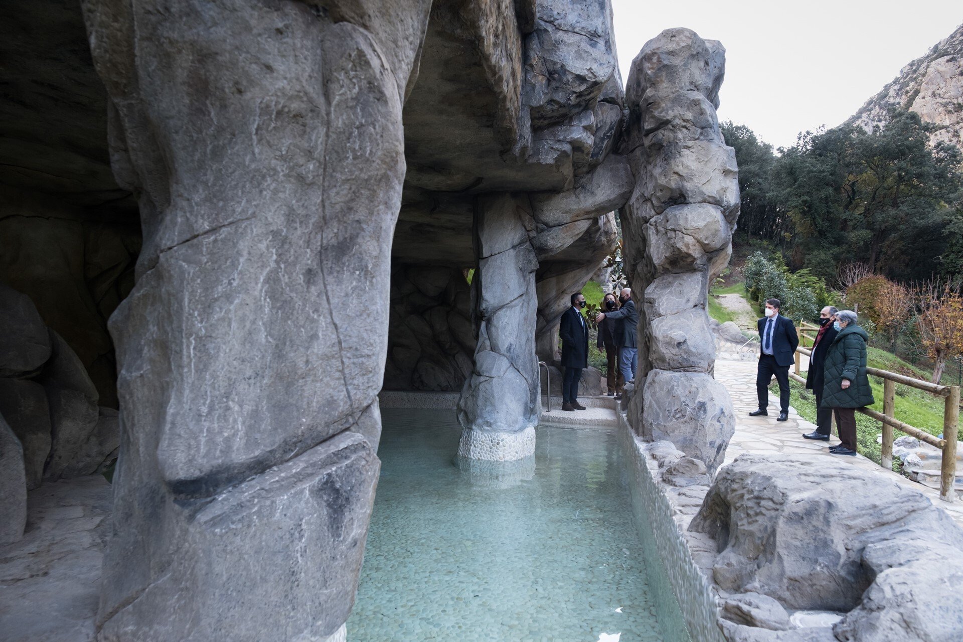 El elemento más destacado del proyecto es una gruta termal, desde la que parten, a modo de cascadas, diferentes ríos de agua caliente para nutrir a tres balsas o pozas termales, que se urbanizan con paseos ajardinados transitables y están dotadas con vallas de protección. Además de las zonas verdes, arbolado y plantas, hay un paseo peatonal accesible, de pavimento duro y antideslizante, que conecta las pozas con el balneario.
