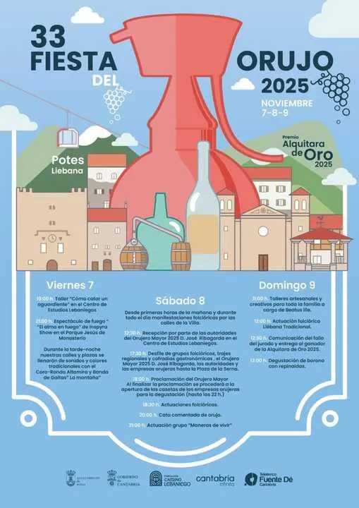 Potes celebrará del viernes 7 hasta el domingo 9 de noviembre la 33 edición de la Fiesta del Orujo, que supone "el fin de semana de mayor afluencia de visitantes de todo el año" en la comarca lebaniega, según ha explicado el alcalde de Liébana, Javier Gómez, durante la presentación del evento, que incluirá música tradicional, exhibiciones de destilación en directo, degustaciones, pasacalles, folclore y actividades culturales.