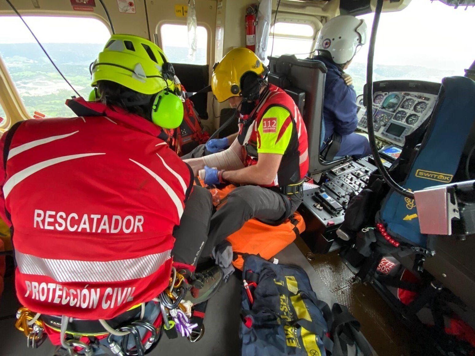En una operación muy técnica, con una grúa de 72,5 metros, el rescatador del helicóptero descendió hasta el afectado y le subió hasta la aeronave, donde fue atendido por el médico en el trayecto hasta Santander.