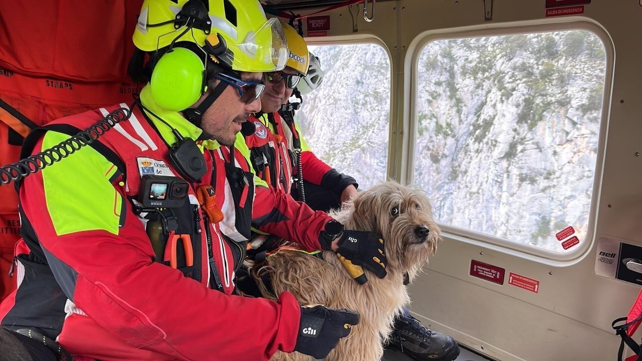 El equipo del helicóptero del Gobierno de Cantabria ha rescatado este jueves a una perra en la canal de Cuetu D'ave, en La Hermida (Peñarrubia), donde se encontraba desde el martes en una repisa entre paredes verticales de la que no se podía mover.